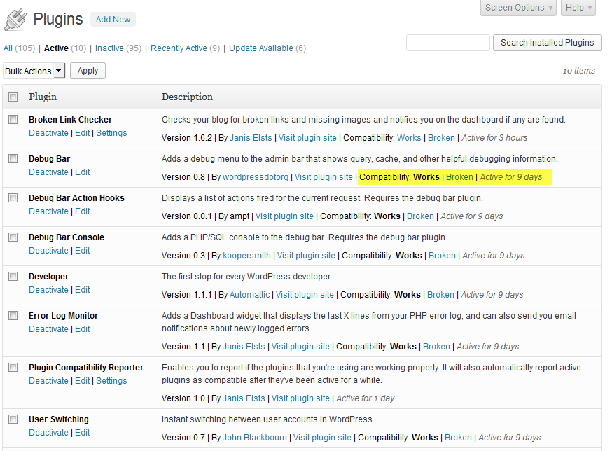 Plugin Compatibility Reporter is a WordPress plugin that enables you report if the plugins that you’re using are working properly. It integrates with the compatibility reporting features of the official WordPress.org plugin directory, and lets you mark plugins as “working” or “broken” from within your WordPress dashboard.